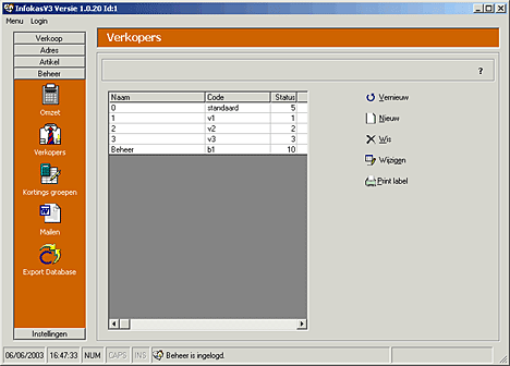 Om een barcodelabel met inloggegevens te printen, ga naar menu 'Beheer' en kies 'Verkopers'. Selecteer de gewenste gebruiker en klik op het icoontje 'Print label':