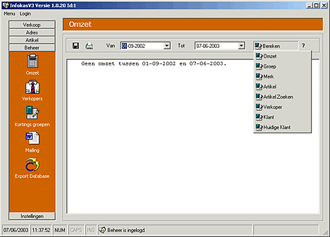 Met Infokas kunt u een grote verscheidenheid aan omzetgegevens in beeld brengen. Zo kunt u bijvoorbeeld de omzet opvragen van alle kledingstukken in de maat 'XXL' van vorige zomer, of bijvoorbeeld de omzet van alle cd's van 'K3' van afgelopen week. Wanneer u de omzetgevevens wilt opvragen, logt u eerst in als beheerder, gaat u naar menu 'Beheer' en klikt u op het icoon 'Omzet':