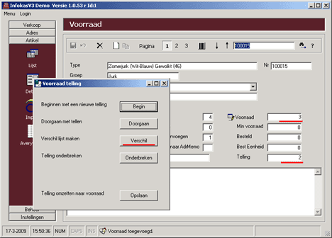De zomerjurk staat in de lijst, de telling is 2 terwijl de voorraad 3 hoort te zijn.