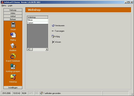 InfokasV3 is voorbereid voor een koppeling met een webwinkel op internet. Het is mogelijk om databases rechtstreeks te koppelen, te koppelen via een Sync database of om te werken met XML / CSV bestanden. De rechtstreekse koppeling is bijvoorbeeld mogelijk met osCommerce, Wordpress - WooCommerce en Joomla VirtueMart. Met de Sync database kan elke (afhankelijk van uw webshop bouwer) webshop gekoppeld worden.