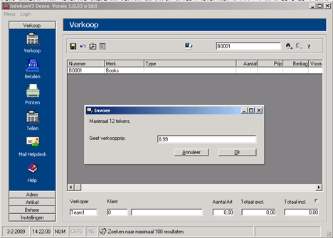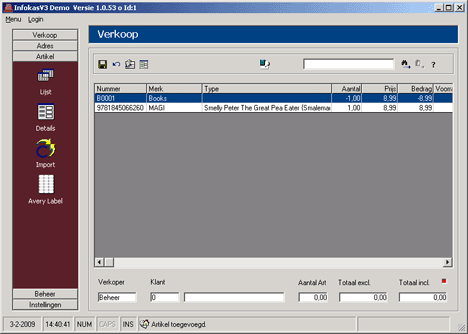 Het totaal van de verkoop is dan € 0,00 en lijkt dus weinig nut te hebben maar hiermee wordt de voorraad hersteld. Er kan bij Beheer - Omzet gekeken worden hoeveel omzet en marge er is gemaakt op dit boek, de schrijver van het boek, de uitgever of de omzetgroep.