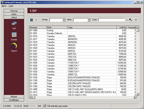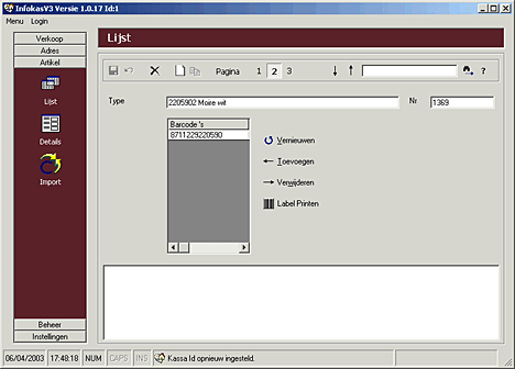 Wanneer u het juiste artikel gevonden heeft, dubbelklikt u op de artikelregel of kiest u 'Enter' om de details te bekijken van het betreffende artikel. U ziet nu de eerste pagina met artikeldetails. Ga naar de tweede pagina om de barcode gegevens op te vragen; klik hiervoor op het icoontje met het cijfer '2' (voor informatie over het opvragen van artikeldetails, klik hier).