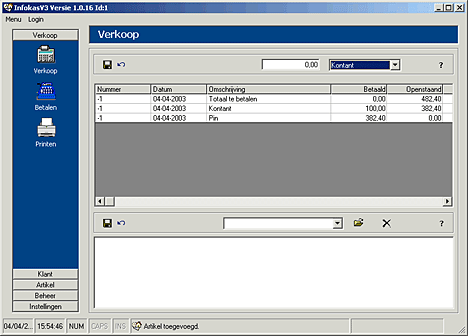 De K van Kas (contant), bevestig met Enter, het restbedrag is nu 382.40 |