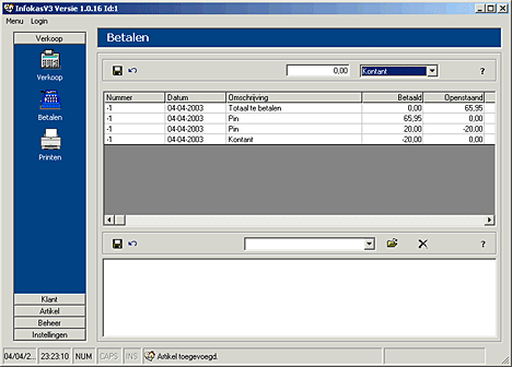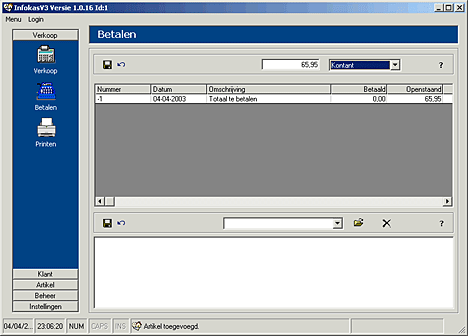 Stel, een klant wil een artikel betalen van € 65,95 met zijn pinpas en hij wil € 20,00 extra pinnen om in contanten te krijgen. U selecteert eerst de artikelen, voegt eventueel klantgegevens toe en ziet nu het onderstaande scherm: