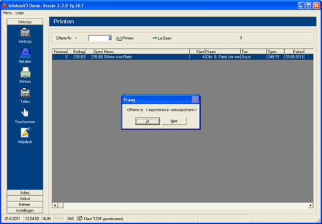 Iedere selectie in het verkoopscherm kan opgeslagen worden als offerte en kan vervolgens afgedrukt worden. Deze functie kan gebruikt worden om een echte offerte te maken maar ook of een selectie voor later gebruik op te slaan. Bijvoorbeeld om een samengesteld produkt te maken zoals een computer.
