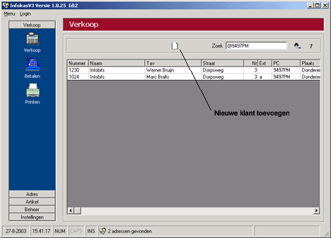 Vraag de klant naar zijn/haar huisnummer en controleer of dit overeenkomt met het huisnummer in de lijst. Komt dit huisnummer niet voor, dan heeft u nog geen gegevens van deze klant. Klik op het icoontje 'Nieuwe klant toevoegen' om de gegevens van deze nieuwe klant op te slaan. Komt het huisnummer wel voor in de lijst, blader dan met de pijltjestoetsen naar de klantgegevens en selecteer met 'Enter'. U kunt ook dubbelklikken op de klantregel.