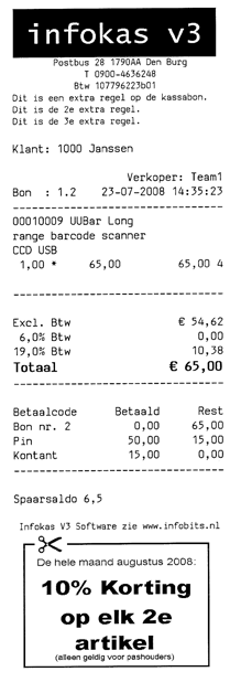 BonSpaar J of N, print spaarsaldo op de bon (alleen als de verkoop op naam is).