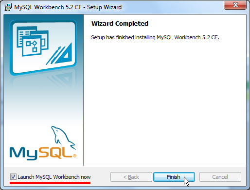 Vink 'Launch MySQL Workbench now' aan en klik op 'Finish'.