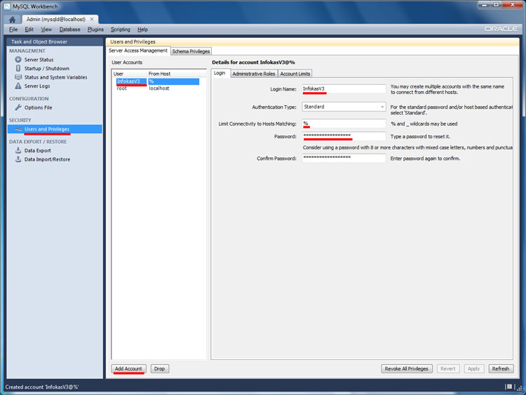 'Password' = 'mysql5ww' of een eigen wachtwoord.