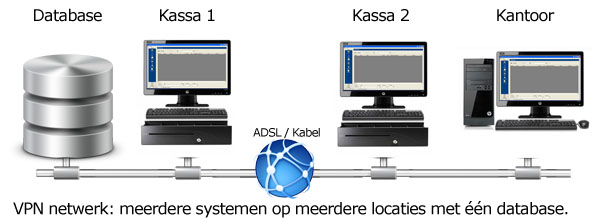 Alle systemen delen één database, nieuwe artikelen die op het kantoor systeem worden ingevoerd zijn direct zichtbaar in de kassa. De aankoop van een klant bij kassa 1 is ook zichtbaar op kassa 2 en op het kantoor systeem. De omzet is zichtbaar per kassa en als totaal. De voorraad is altijd actueel.
