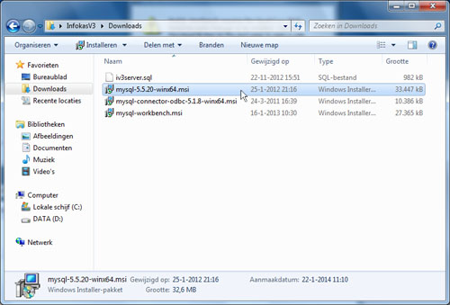 Dit voorbeeld gaat uit van Server versie 5.5.20 voor Windows x64, afhankelijk van uw systeem (x32 of x64) en de versie die u download kunnen de installatie voorbeelden iets afwijken.