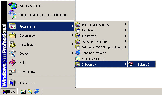 Klik op 'Start', ga naar 'Programma's', dan naar de map 'InfokasV3' en kies 'InfokasV3':