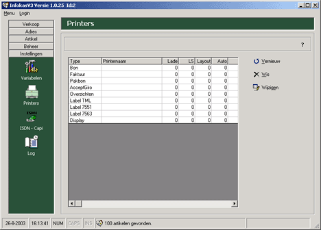 Om de printers voor gebruik met Infokas in te stellen, moet u eerst Infokas opstarten (informatie over het opstarten van Infokas vindt u hier). Als u Infokas opgestart heeft, ziet u onderstaand scherm: