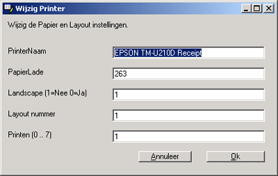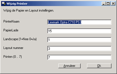 Bij 'PrinterNaam' en 'PapierLade' hoeft u niets te wijzigen; deze worden automatisch door het programma overgenomen uit het vorige scherm.