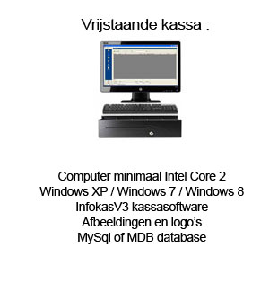 Installatie op een vrijstaande computer, de database kan naar keuze Access/MDB (traag maar simpel te installeren) of MySql zijn (snel maar moeilijker te installeren). De (helaas) meest voorkomende reden voor dataverlies is de diefstal van de kassacomputer. Zorg dat u een backup maakt op een USB stick of via een on-line service zoals kpn-online of programma zoals dropbox/skydrive/googledrive. Een back-up op een externe schijf is ook weg als u deze naast de kassa laat liggen.