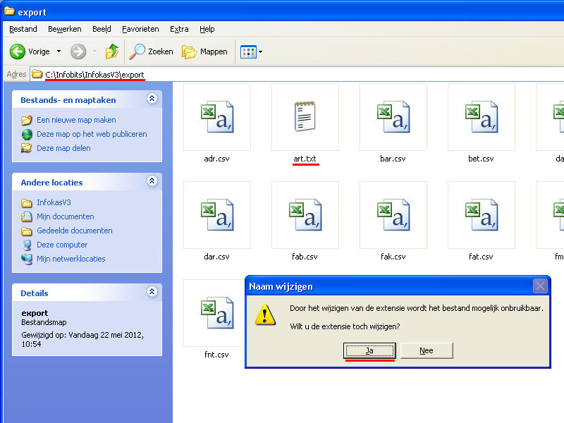 Vervolgens bladert u in Windows Verkenner naar de map 'InfokasV3\Export': hier vindt u de bestanden 'adr.csv' en 'art.csv', respectievelijk uw adres- en artikelbestand. Hernoem deze bestanden naar 'adres.csv' en 'artikel.csv' en plaats ze op een floppy-disk of cd-rom.