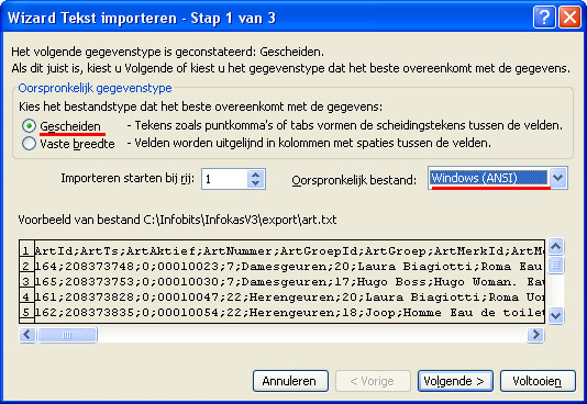 In dit voorbeeld is het bestand art.csv geopend in Excel en door Excel is het artikelnummer 00010023 (een EAN8 barcode) gewijzigd in 10023 en nummer 01-3037 is gewijzigd in jan-37.