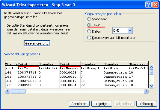 selecteer [Tekst] als gegevenstype per kolom bij Artikel timestamp, Artikel nummer en bij de Barcodes