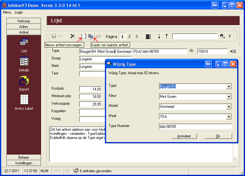 Per artikel wordt de voorraad bijgehouden. Door tijdens verkoop op dit type nummer te zoeken is direct zichtbaar welke kleuren maten nog op voorraad zijn.