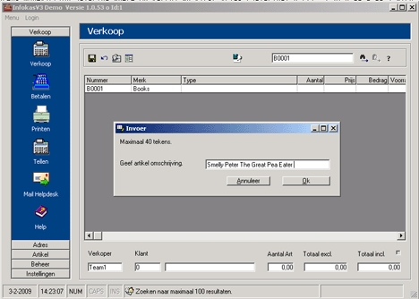 Als er een boek uit de "Childrens Activity Books" verkocht wordt dat nog niet in de database staat, dan kan het book verkocht worden door artikelnummer B0001 in te voeren of door op F1 te drukken.
