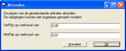 De verkoopprijs wordt in dit geval bepaald op € 16,75 = 41% in plaats van de ingevoerde 40%. Dat komt door de afrond functie. Bij 'instellingen - variabelen' staan de variabelen 'MinPrijsAfronden' standaard op 'N' = Niet afronden en 'VerPrijsAfronden' standaard op '25' = afronden op € 0,25.