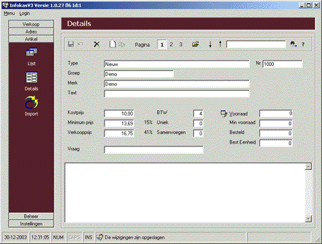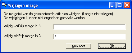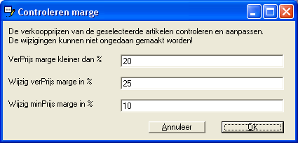 Bij het invoeren van prijzen kan gebruik worden gemaakt van de procent functie. Bijvoorbeeld bij nieuw artikel met een kostprijs van € 10,00 kan de minimum prijs ingesteld worden met %15 en de verkoopprijs met %40. Bij het opslaan of bij het verlaten van het veld d.m.v. de enter toets wordt de juiste prijs uitgerekend.
